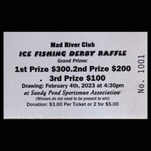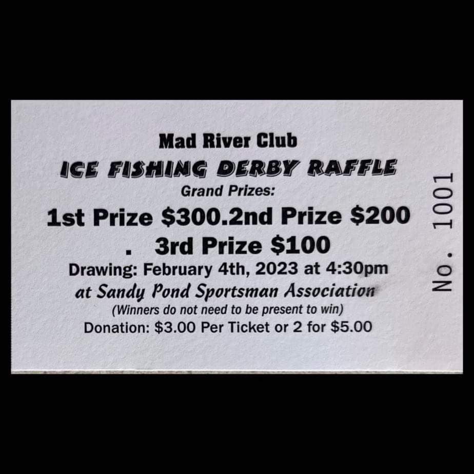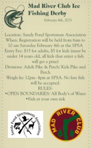 Mad River Club ice fishing derby Saturday February 4th at the Sandy Pond Sportsman club, registration 6am-10am. Tickets now available and going out in mail. Online sales available also. Please support the club by helping out with the derby and get the kids involved.